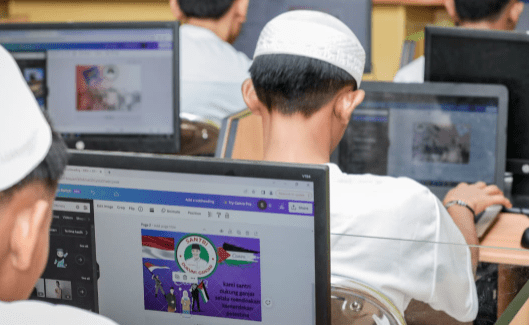 Dalam pelatihan tersebut, para santri diarahkan untuk membuat poster berisi dukungan untuk Palestina yang nantinya bisa mereka bisa sebarkan di media sosial sebagai bentuk perlawanan terhadap Israel.