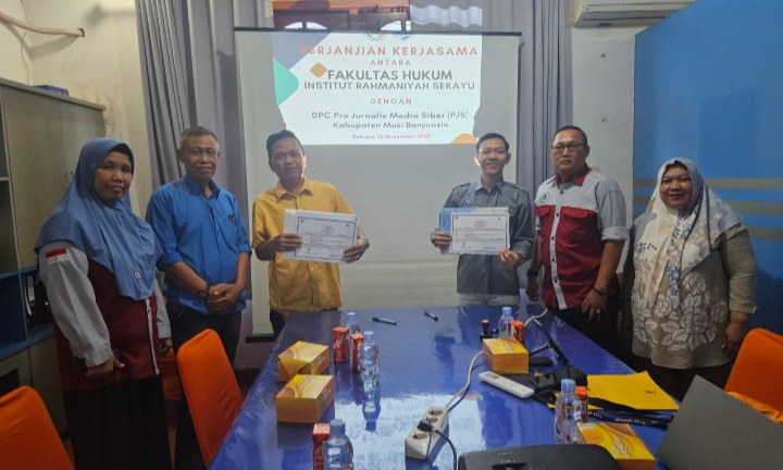 MoU tersebut ditandatangani oleh Rektor Dr Wandi Subroto SH MH, Dekan Fakultas Hukum IRS Dr H Syaparuddin SH MH bersama Ketua Pro Jurnalismedia Siber (PJS) Riyansyah Putra SH CMSP, dihadiri sejumlah Jajaran Institut Rahmaniyah Sekayu.