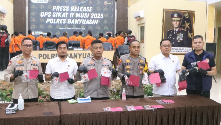 BANYUASIN, VIRALSUMSEL.COM – Polres Banyuasin kembali menunjukkan taringnya dalam memberantas kejahatan melalui Operasi Sikat II Musi 2025. Selama 15 hari pelaksanaan, mulai 30 Oktober hingga 13 November 2025, jajaran Polres berhasil mengungkap puluhan kasus kriminal lintas kategori dengan total puluhan tersangka diamankan.