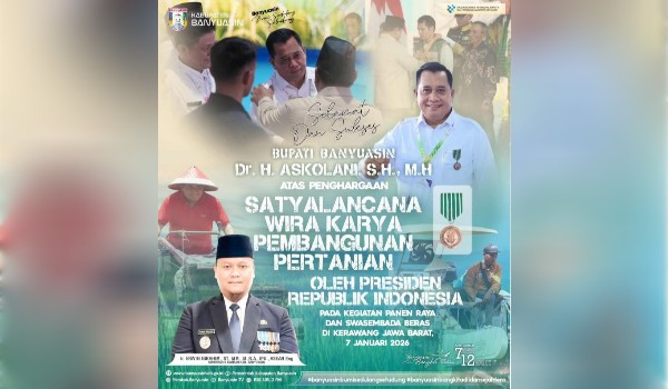“Penghargaan Bintang Wira Karya ini bukan sekadar simbol, tetapi bukti bahwa kerja konsisten, keberpihakan kepada petani, serta kebijakan yang berbasis kebutuhan rakyat benar-benar dirasakan manfaatnya. Kepemimpinan Bupati H. Askolani telah membawa Banyuasin menjadi daerah yang kuat di sektor pangan dan berkontribusi bagi ketahanan pangan nasional,” ungkapnya.