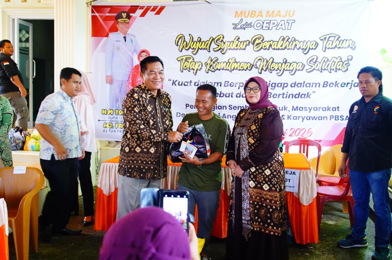 BABAT TOMAN, — Bupati Musi Banyuasin (Muba) H M Toha Tohet SH berbagi kebahagiaan dengan masyarakat Desa Sungai Angit, Kecamatan Babat Toman, Jumat (2/1/2026).