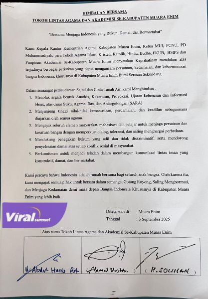Tokoh Lintas Agama dan Akademisi Se-Kabupaten Muara Enim, menghimbau Jaga Indonesia yang Rukun Damai dan Bermartabat